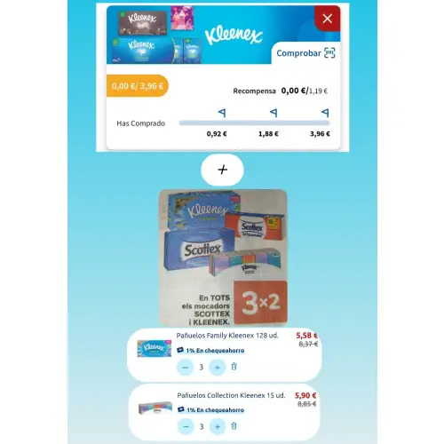 Las cajas de pañuelos estan al 3x2 hasta el lunes 21/4. Si tienes el reto en la app te salen las 3 cajas a 4,39€. Recuerda que hay que activar el reto antes de comprar el producto.